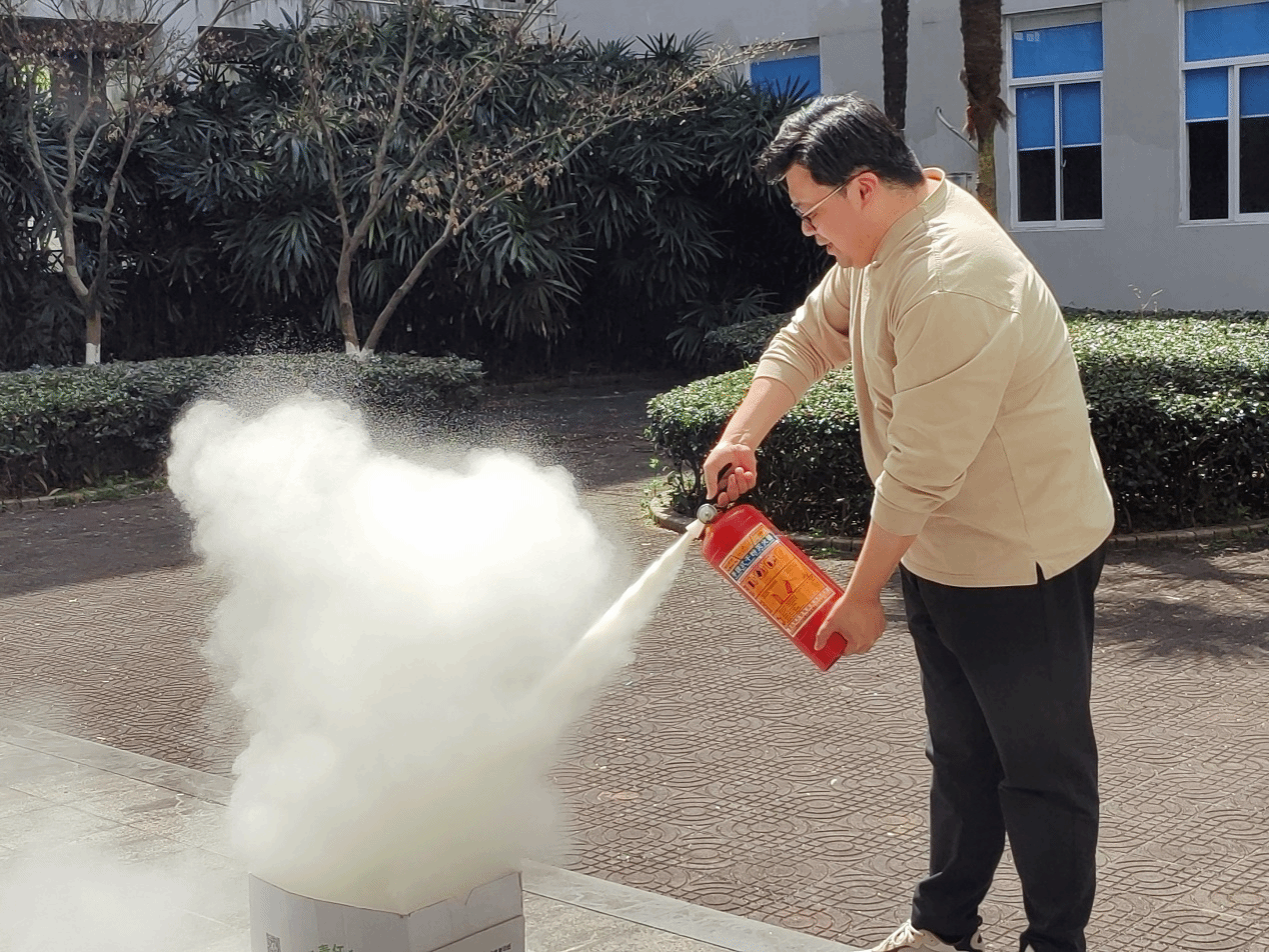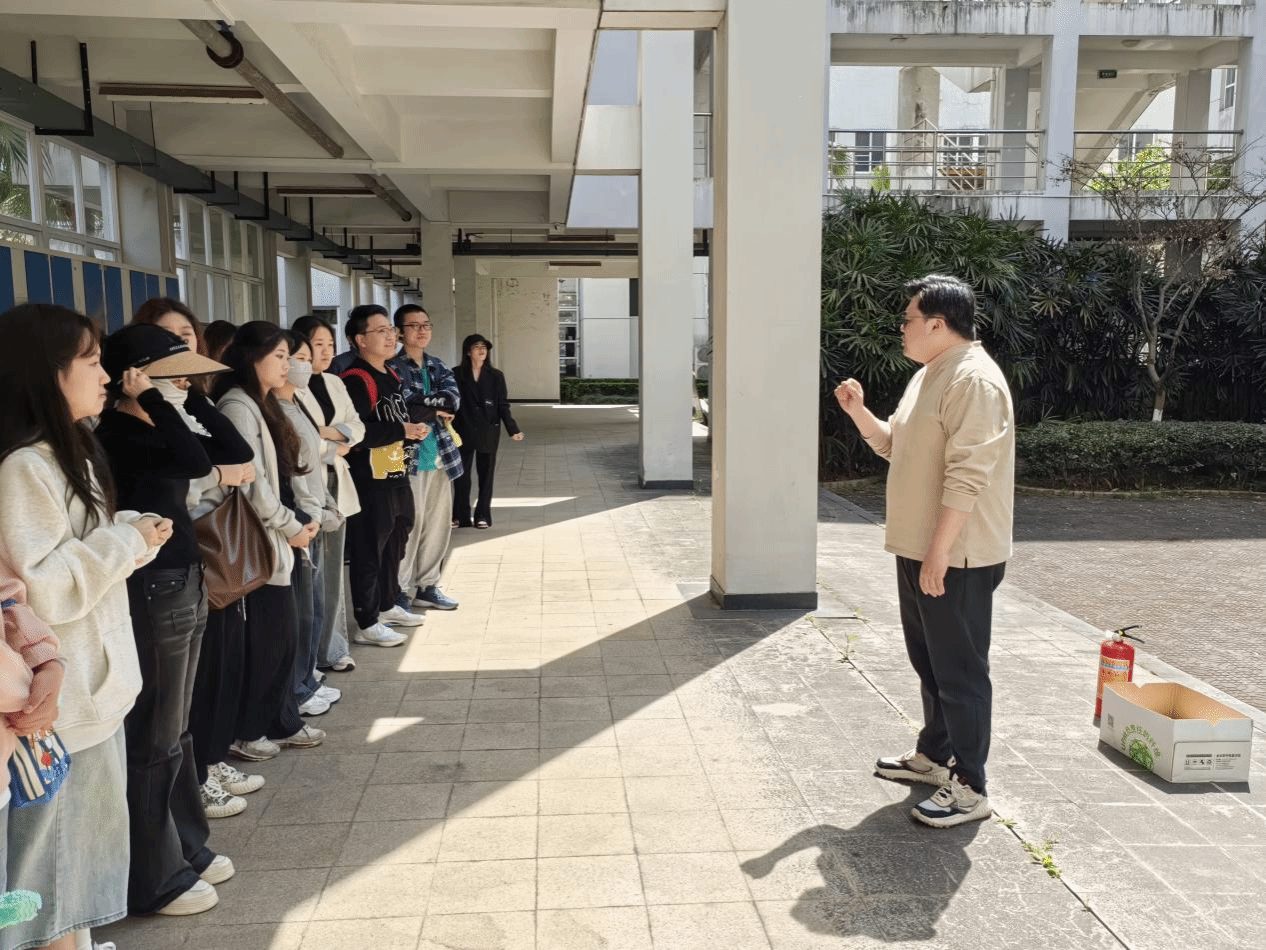 演习开始,学工办副主任胡震鹏给同学们简介消防知识,指导同学们在遇到火情时正确的应对办法和撤离方法。进行灭火器的使用教学,并现场模拟演示。“一摇,二拔,三喷”的口令让师生们对使用干粉灭火器有了初步的了解,部分师生也参与其中,上前体验灭火器使用的操作流程。