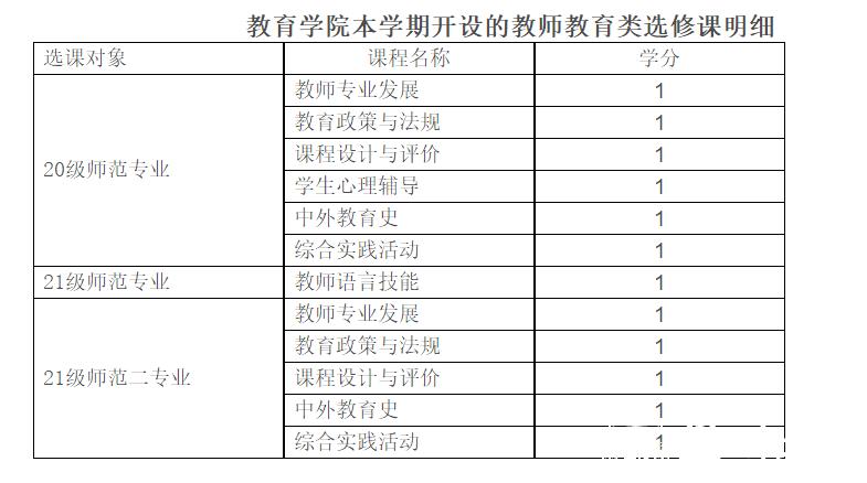 根据金沙9001cc诚为本师范类专业本科人才培养方案要求,师范生需修读教师教育类选修课,20级、21级学生需修满3学分(具体以各自专业的培养方案为准)。该类课程设置分为教育学院面向全校师范专业统一选课开设及学生所在学院专业内独立选课开设两类。现开展教育学院面向师范专业开设教师教育类选修课选课工作,具体如下: